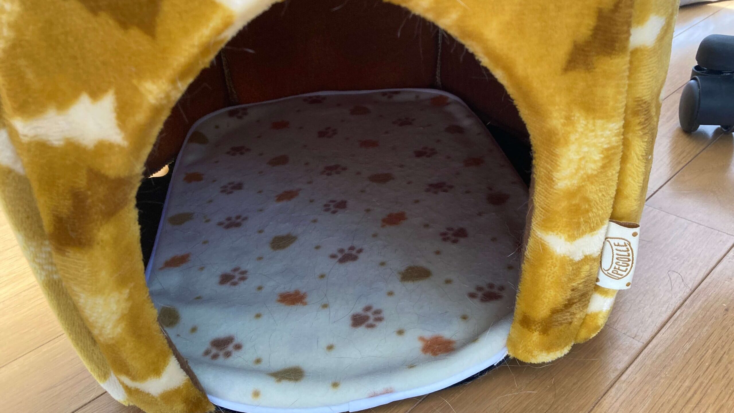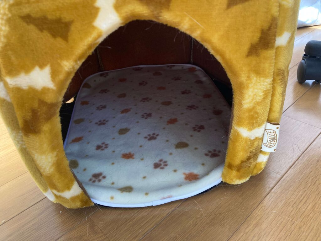 少し寒い程度だったら、ホットカーペットをつけなくても、ふかふかのクッションを入れるだけで猫自身の体温でテントベッド中が温かくなるほど保温性があります。