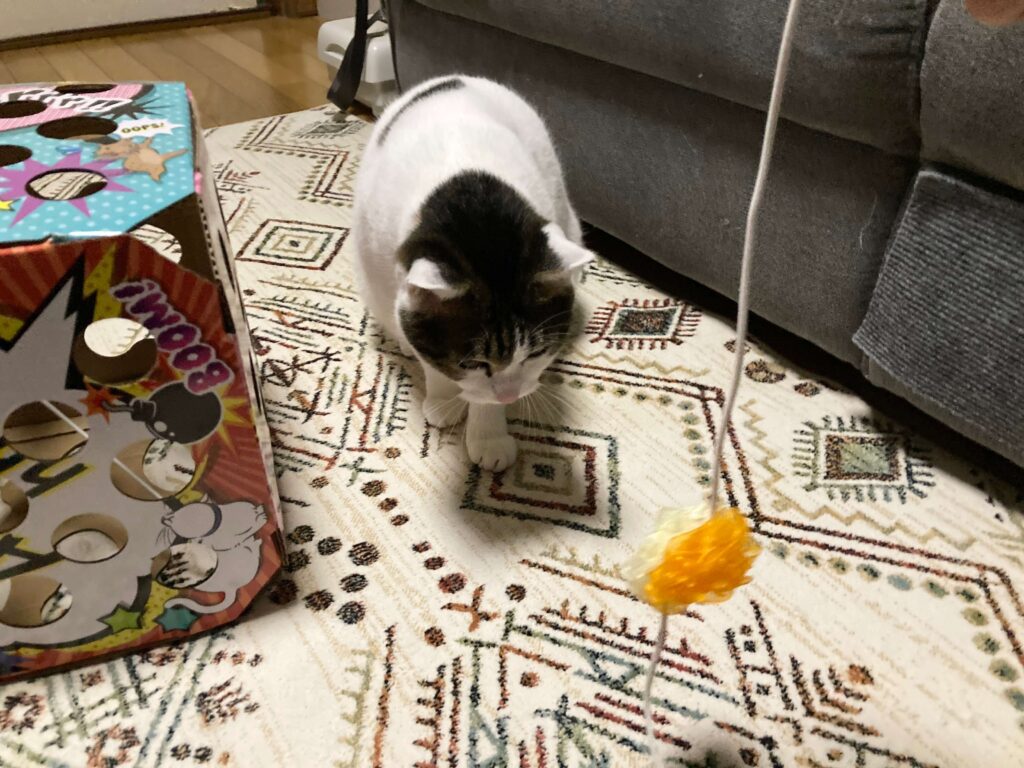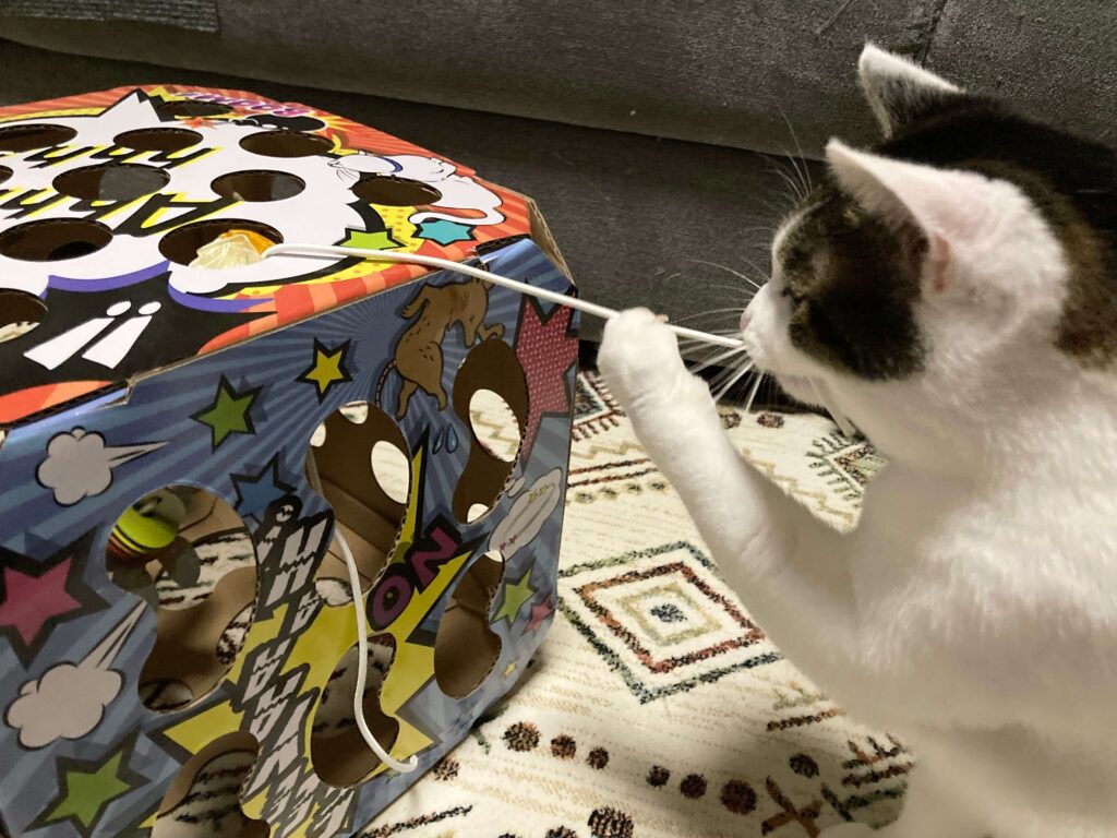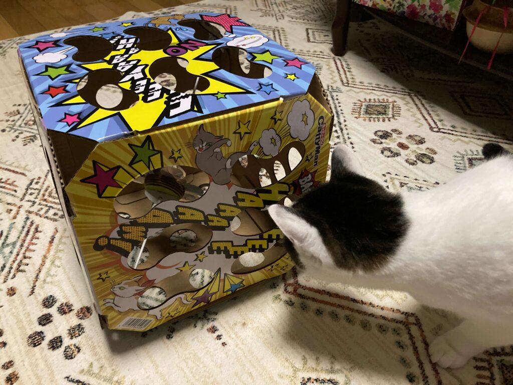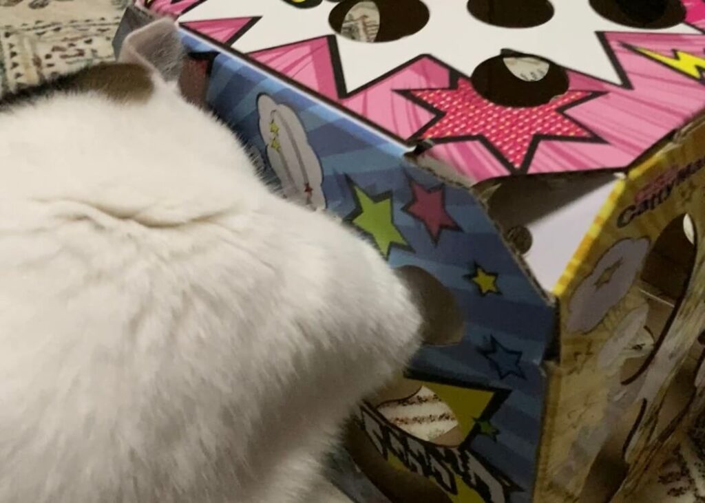 我が家の猫ぼっちゃんは野生を忘れてしまったのかあまり刺さりませんでしたが、このBOXではしゃいでいる猫ちゃん動画もあるので、試してみる価値はあると思います。