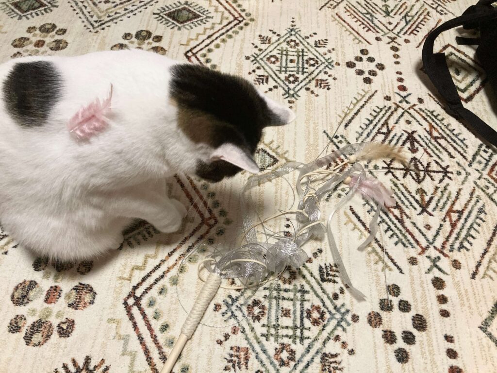 興味を持たせるために振り回していたら、ピンクのフェザーが1枚ちぎれていました。(ぼっちゃんの背中に羽が・・・!)